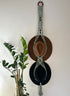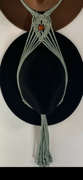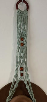 This elegant handmade 131cm (51.6") Sage in colour macrame hat holder combines style and functionality, designed to beautifully display up to two hats. It features expertly crafted square knots surrounded by Twist and alternating square knots. Starting with a large brown wooden ring, five barrel beads though-out and gathering knot with fringe that provides the finishing touch.