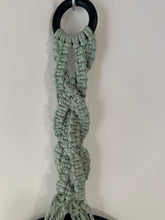 This elegant handmade Sage 132cm (52") macrame hat holder combines style and functionality, designed to beautifully display up to two hats. It features expertly crafted three braided knots, starting with a large brown wooden ring and alternating square knots with fringe that provides the finishing touch.